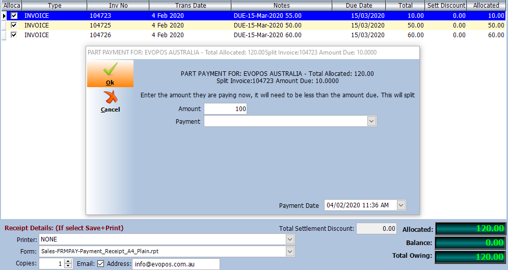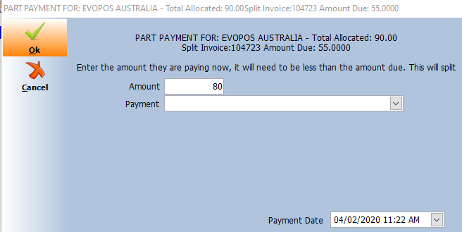 - EVOPOS will confirm to say which invoice it is splitting and by how much