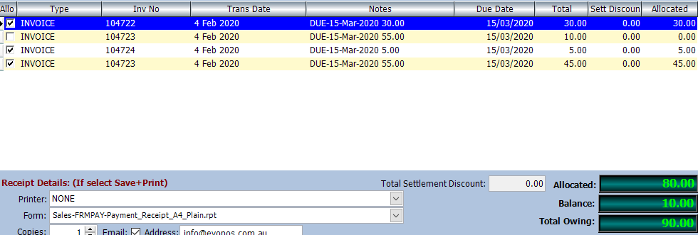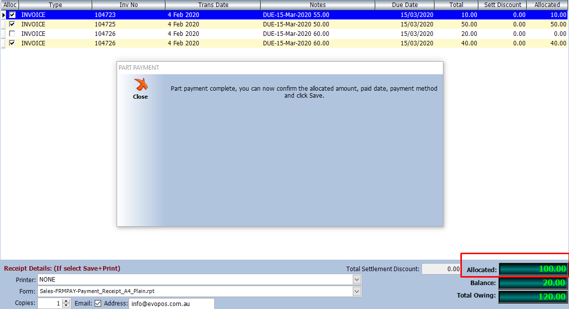 - The invoice is then split and the allocated amount will be updated to the same amount the customer is paying, leaving the balance of the split invoice.
